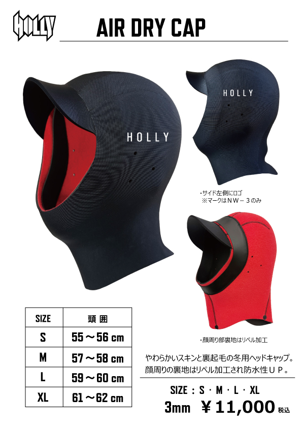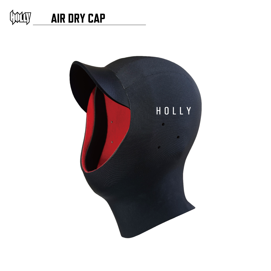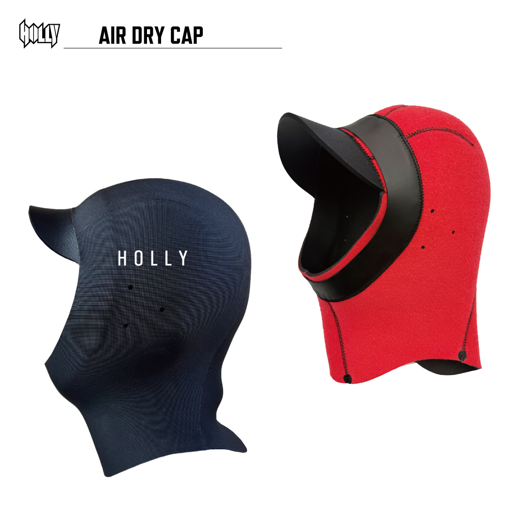 Feb 25th 2026 AIR DRY CAP 発売 3月より防水性・保温性に優れたヘッドキャップ『AIR DRY CAP』の発売です。 生地は3mm裏起毛となり、顔周り裏部分に施されたリぺル加工が水の浸水を最大限まで低減いたします。 お求め・お問い合わせはお近くのHOLLYお取扱店様まで。